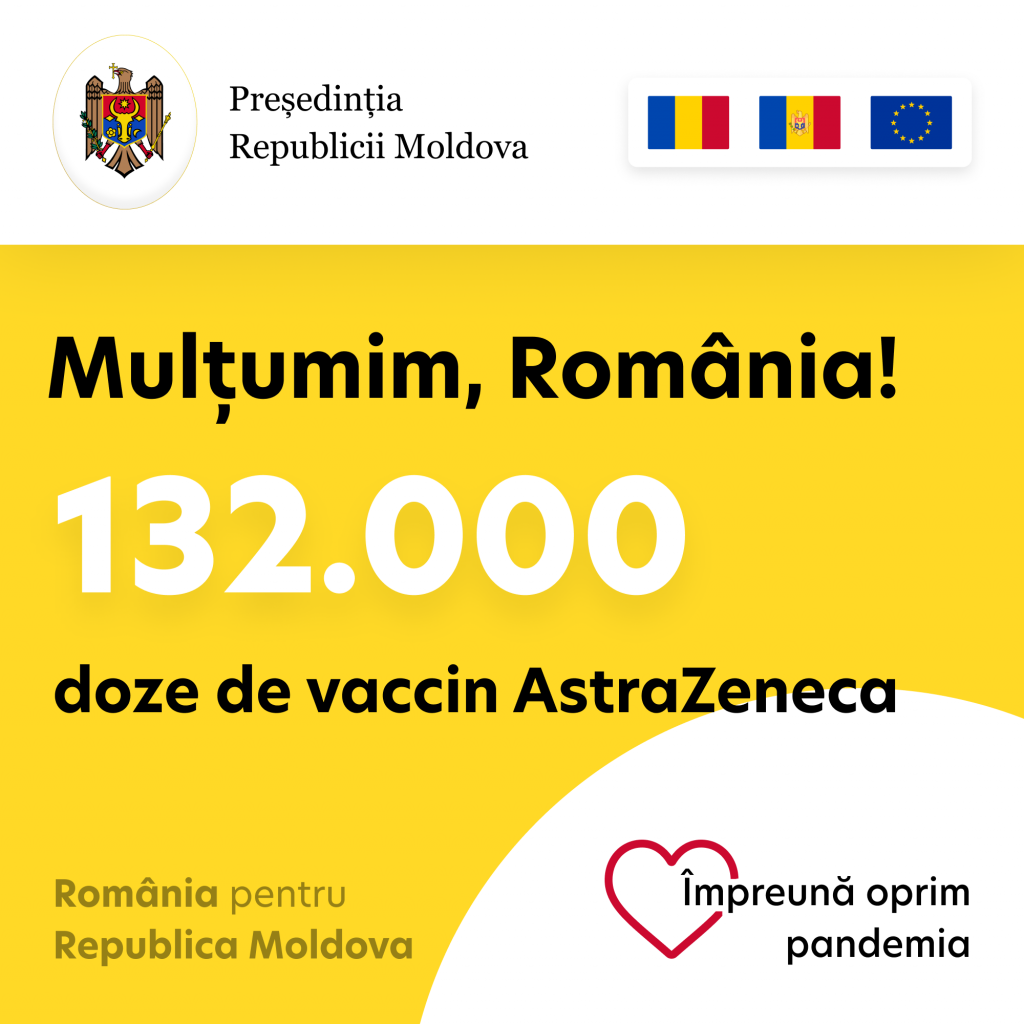„Mulțumim, România, pentru donația generoasă care ne permite să extindem categoriile de persoane vaccinate.” Maia Sandu